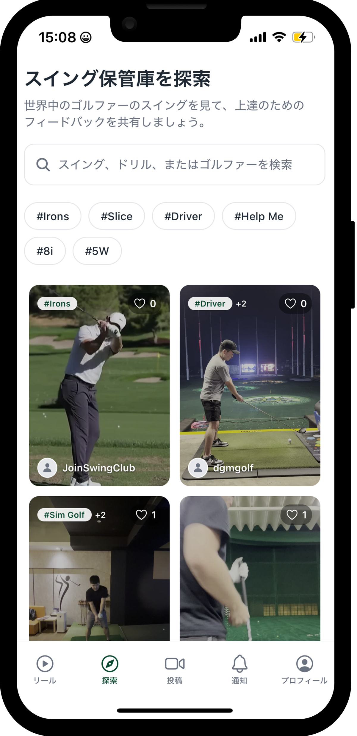 レベルを問わず投稿された最新のスイングを閲覧。気になる視点や上達のヒントを収集。